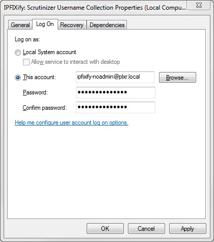 Click the Log On tab, select This account:, enter in the IPFIXify user and password, and then select Apply.